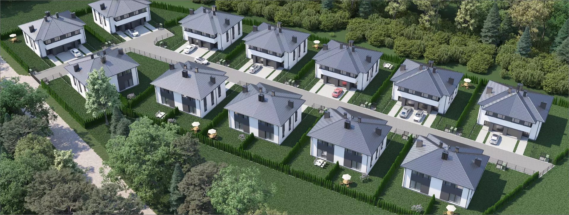 Nasza nowa inwestycja to sześć budynków mieszkalnych dwulokalowych (12 lokali) budowanych według projektu indywidualnego, położonych w cichej, malowniczej części Łomianek Dolnych. Każdy lokal posiada własny ogród oraz dwa miejsca postojowe, z czego jedno w indywidualnym garażu w bryle budynku, zapewniając poczucie swobody oraz komfortu. Odbiór do użytkowania całej inwestycji planowany jest na II kwartał 2025 roku , zakończenie budowy do końca 2024 roku.