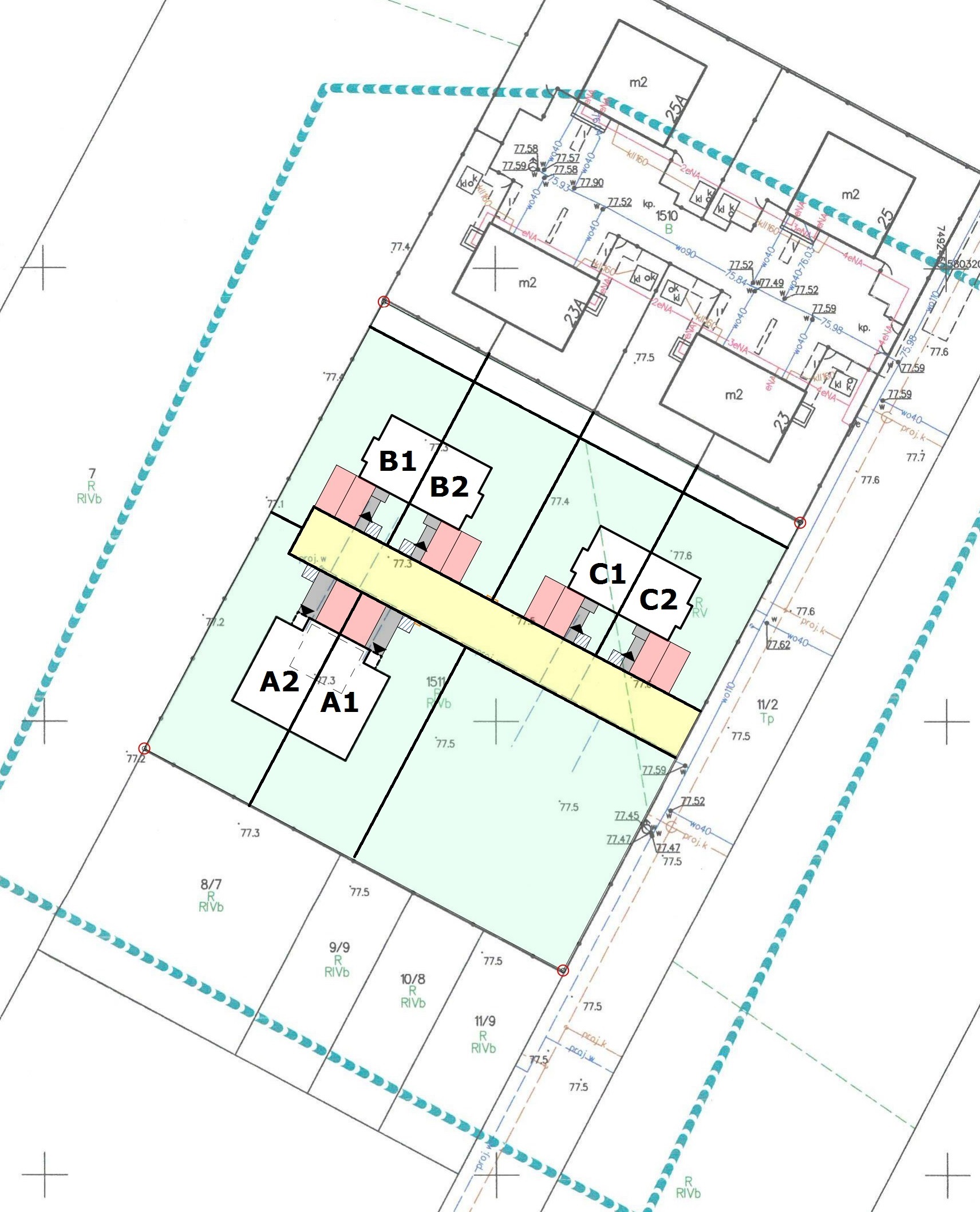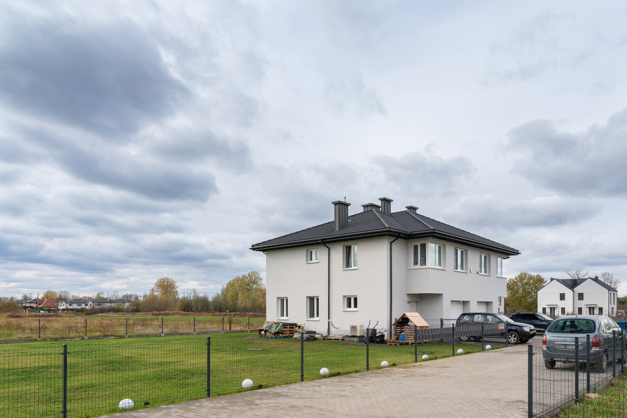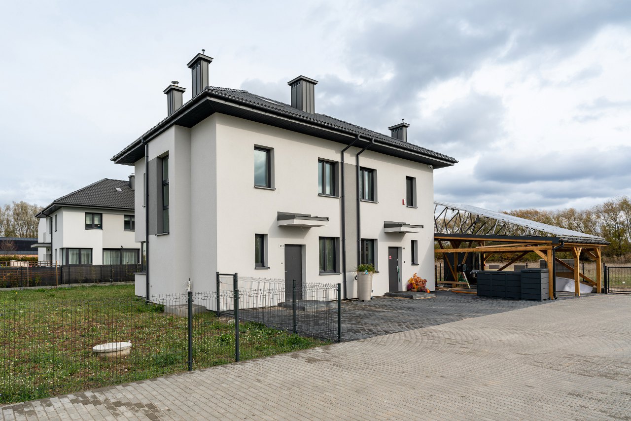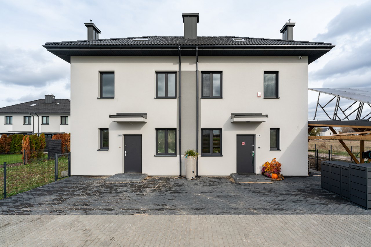 2. lokale o powierzchni użytkowej 68,5m² (powierzchnia całkowita z poddaszem do własnej adaptacji wynosi ok. 100m²), dwupoziomowe składające się z przestronnego salonu z aneksem kuchennym, osobnej łazienki, wc i przedpokoju oraz pełnego piętra bez skosów z trzema sypialniami i łazienką. Przed budynkiem znajdują się dwa miejsca postojowe do wyłącznego korzystania. Powierzchnie działek ok. 260m², powierzchnie ogródków ok. 170m²