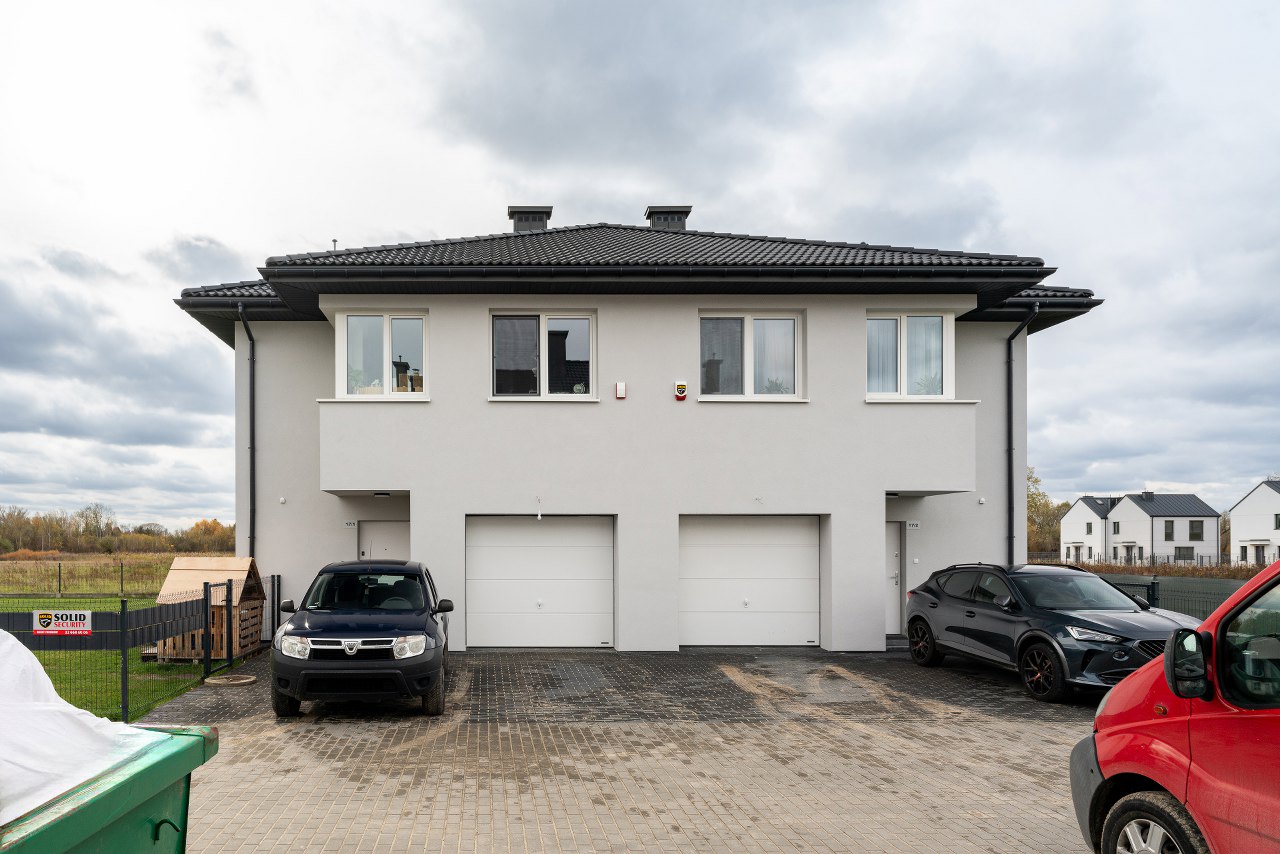 1. lokale o łącznej powierzchni 121m², dwupoziomowe składające się z przestronnego salonu z aneksem kuchennym, osobnej łazienki, wc i przedpokoju oraz pełnego piętra bez skosów z czterema sypialniami i łazienką. W bryle budynku garaż a drugie miejsce postojowe znajduje się przed budynkiem. Powierzchnie działek ok. 360m²,. powierzchnie ogródków ok. 250m².